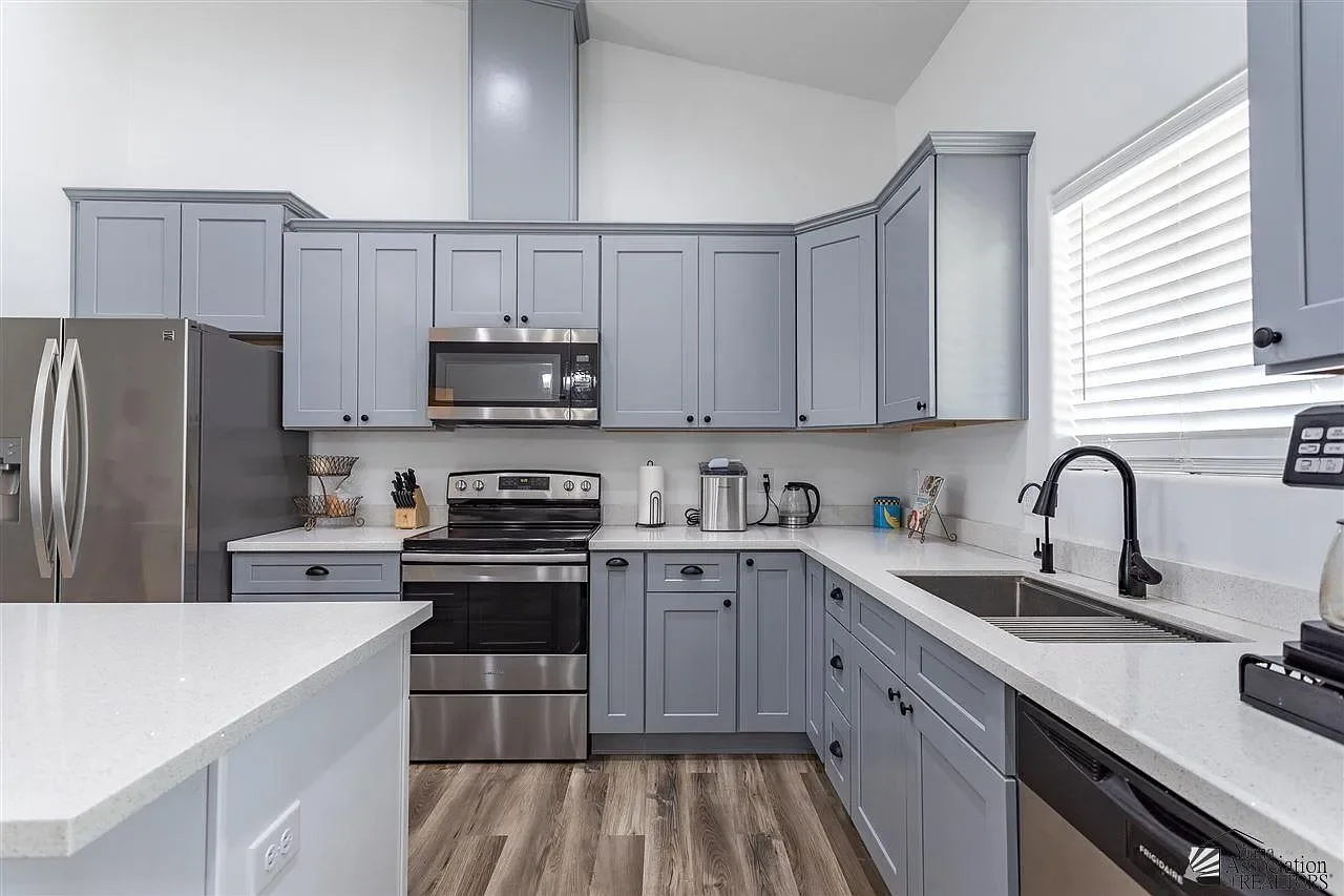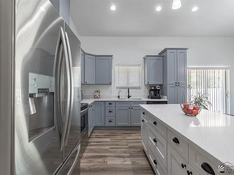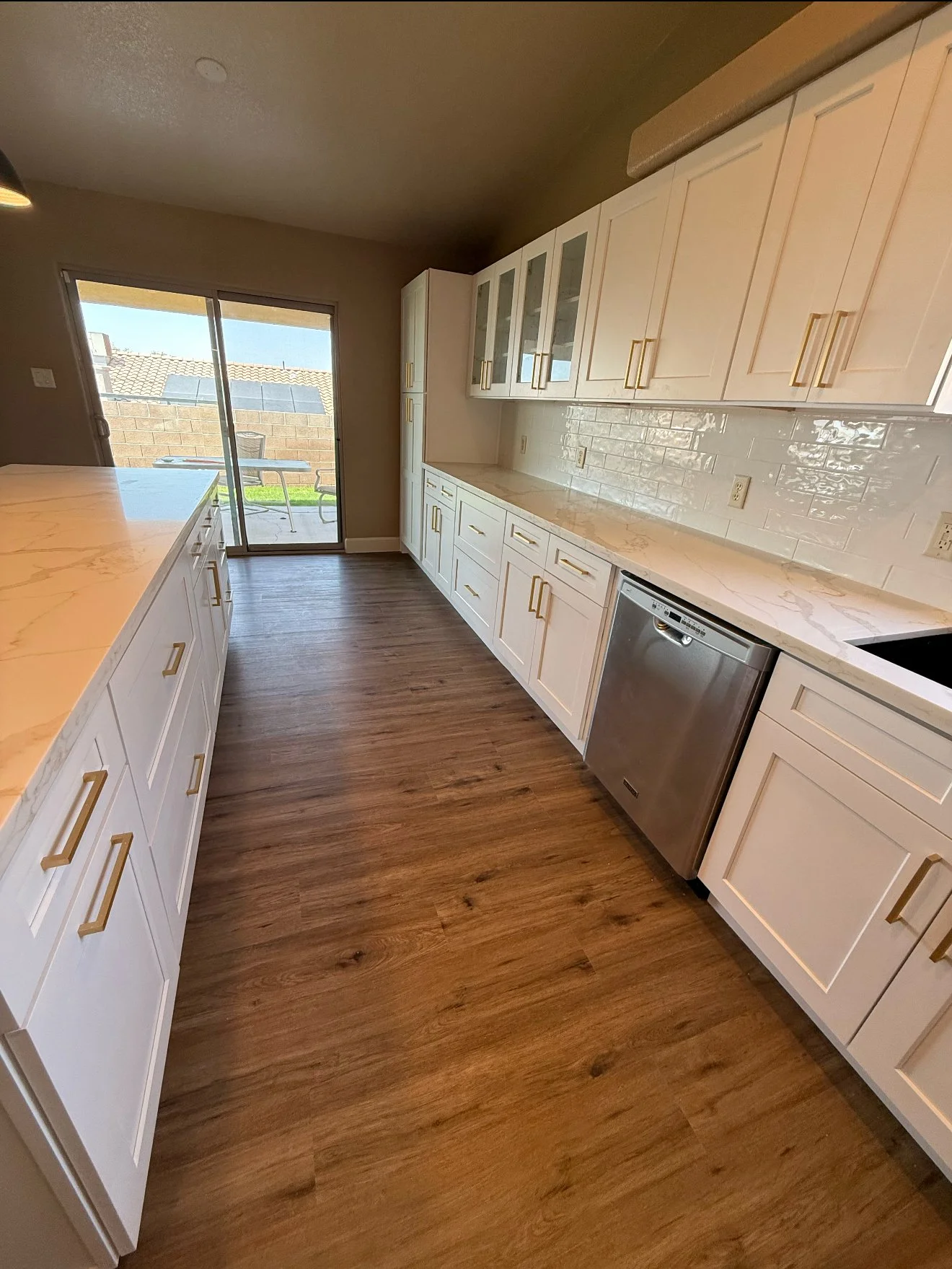 This remodel features simple and clean white shaker cabinets paired with elegant quartz countertops, offering a timeless and fresh look that suits any style.