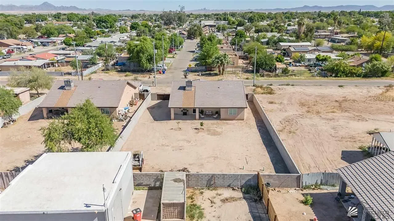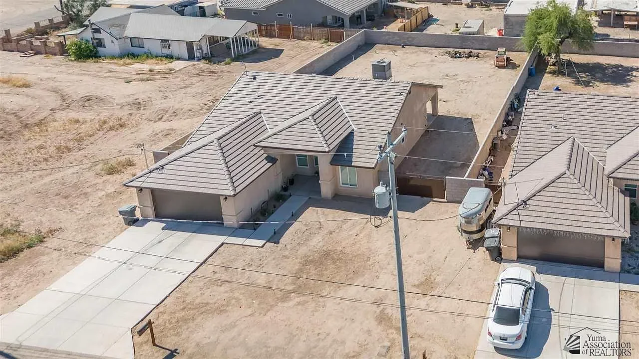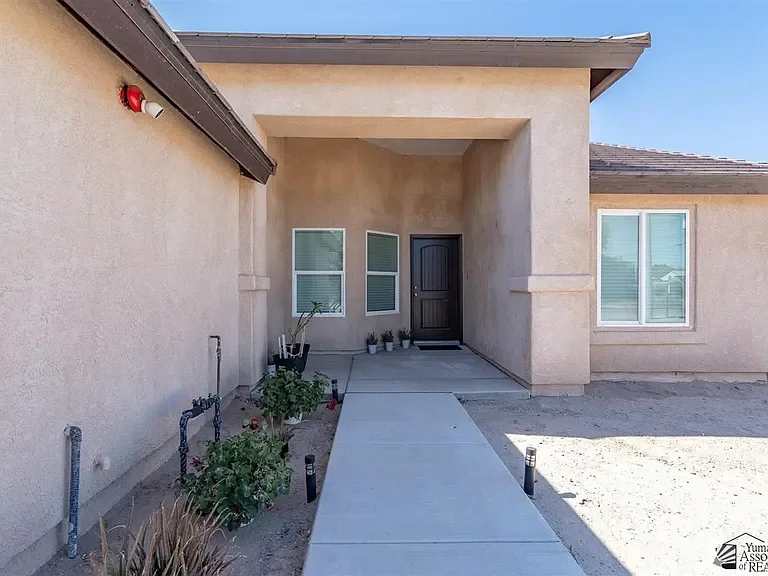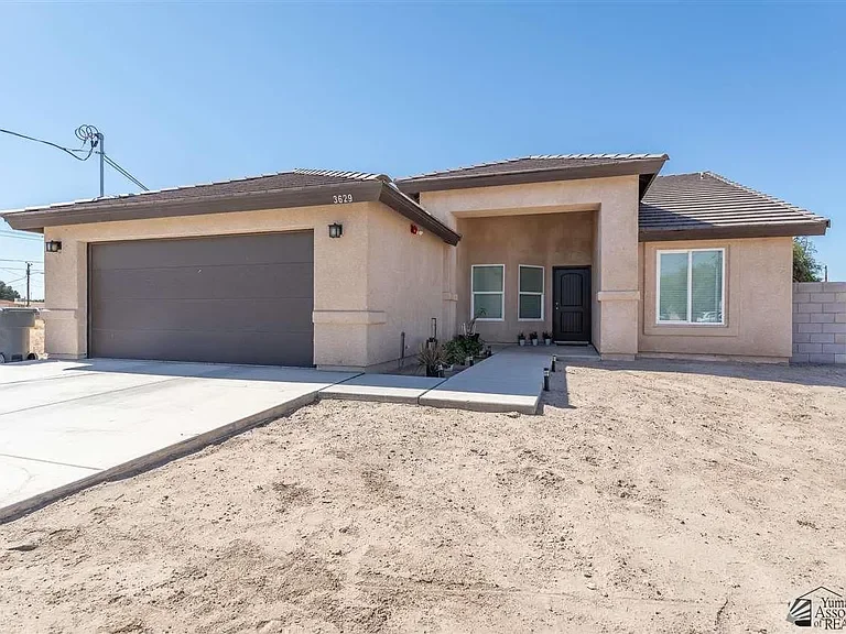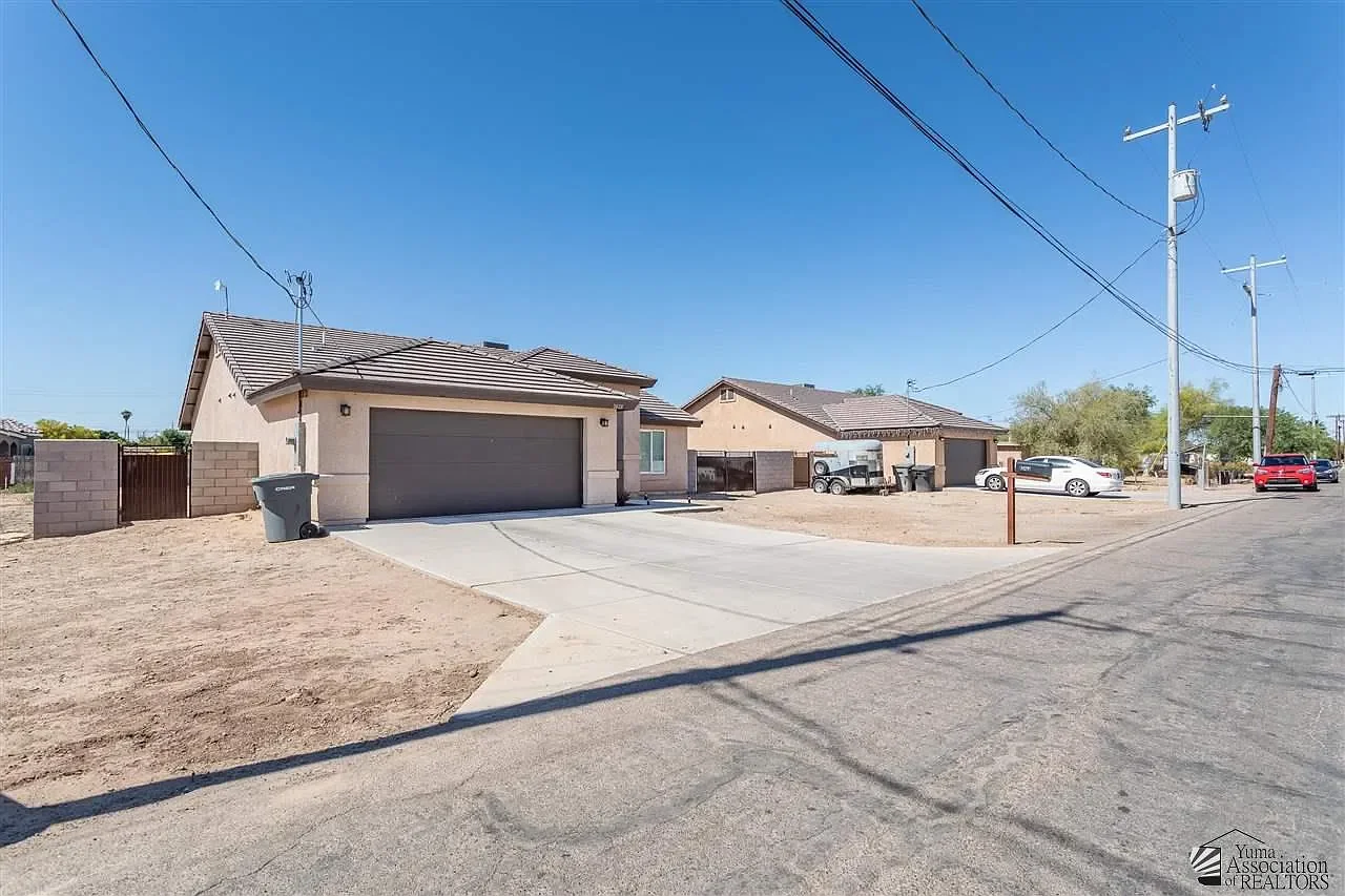 This striking modern home features bold architectural lines, a sleek flat roof, and floor-to-ceiling glass that opens to a front-facing balcony. Elevated above street level with a dramatic concrete driveway and terraced block retaining walls, it blends minimalist design with urban sophistication in the heart of Yuma.