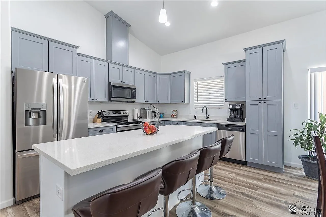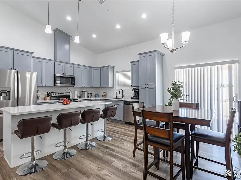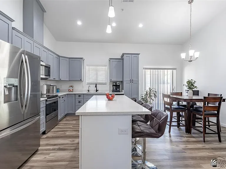 Modern remodel featuring grey shaker cabinets, quartz counterops, backsplash , and a custom dining table with a matching waterfall edge for a seamless, stylish look.