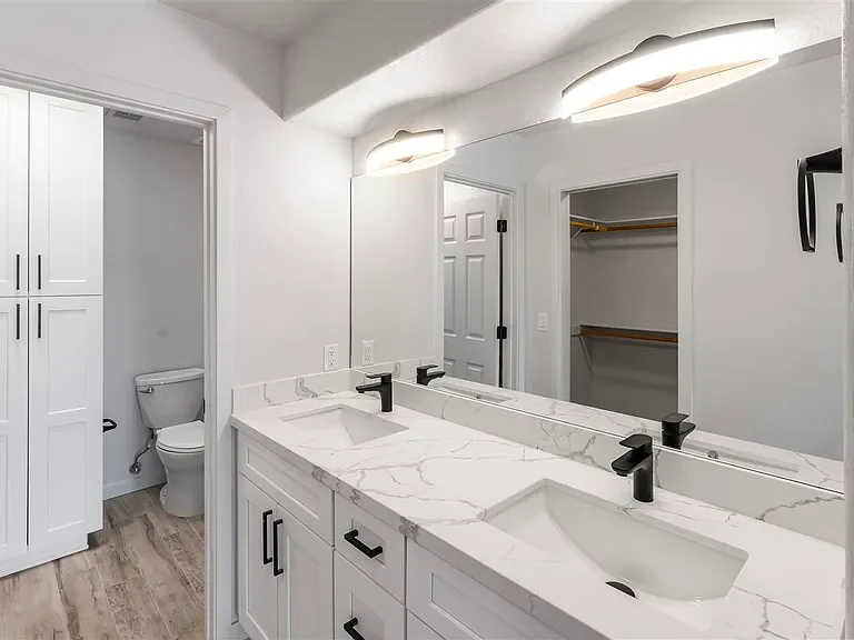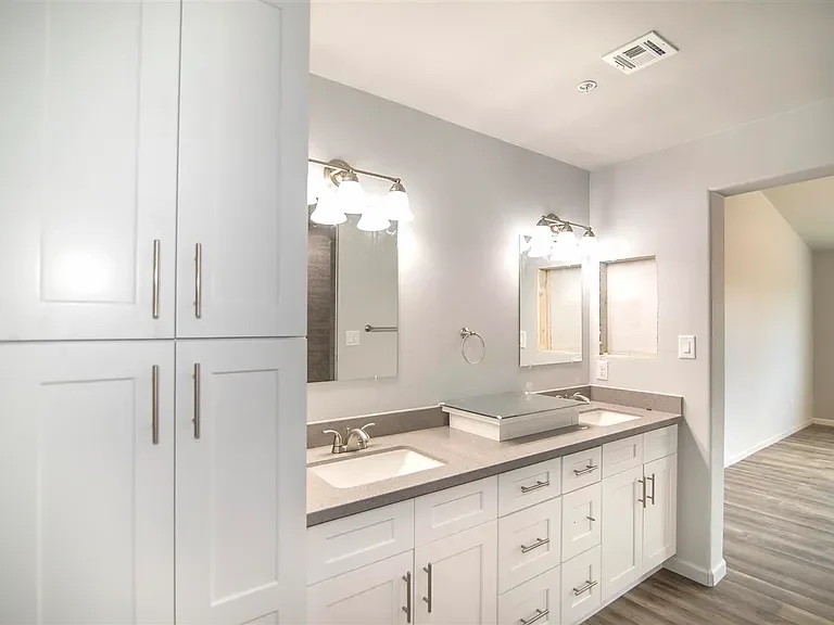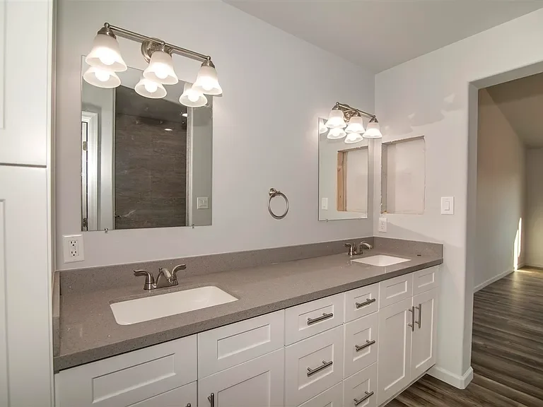 This home showcases a stylish remodel featuring European-style shaker cabinets with clean white uppers and warm oak lowers, creating a balanced, modern look. The bathrooms have been updated with matching cabinetry and sleek new countertops, tying the design together with a cohesive and elegant finish.