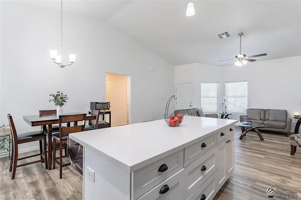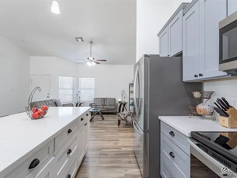 This beautifully updated manufactured home features elegant taupe European shaker cabinets paired with stunning Cristallo quartzite countertops. The high-end finishes bring a refined, modern touch to the space, combining durability with sophisticated style throughout the kitchen and bathrooms.