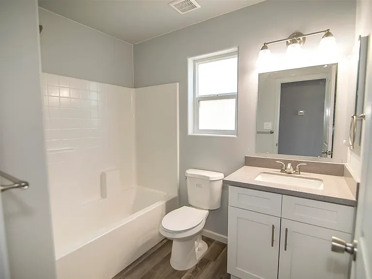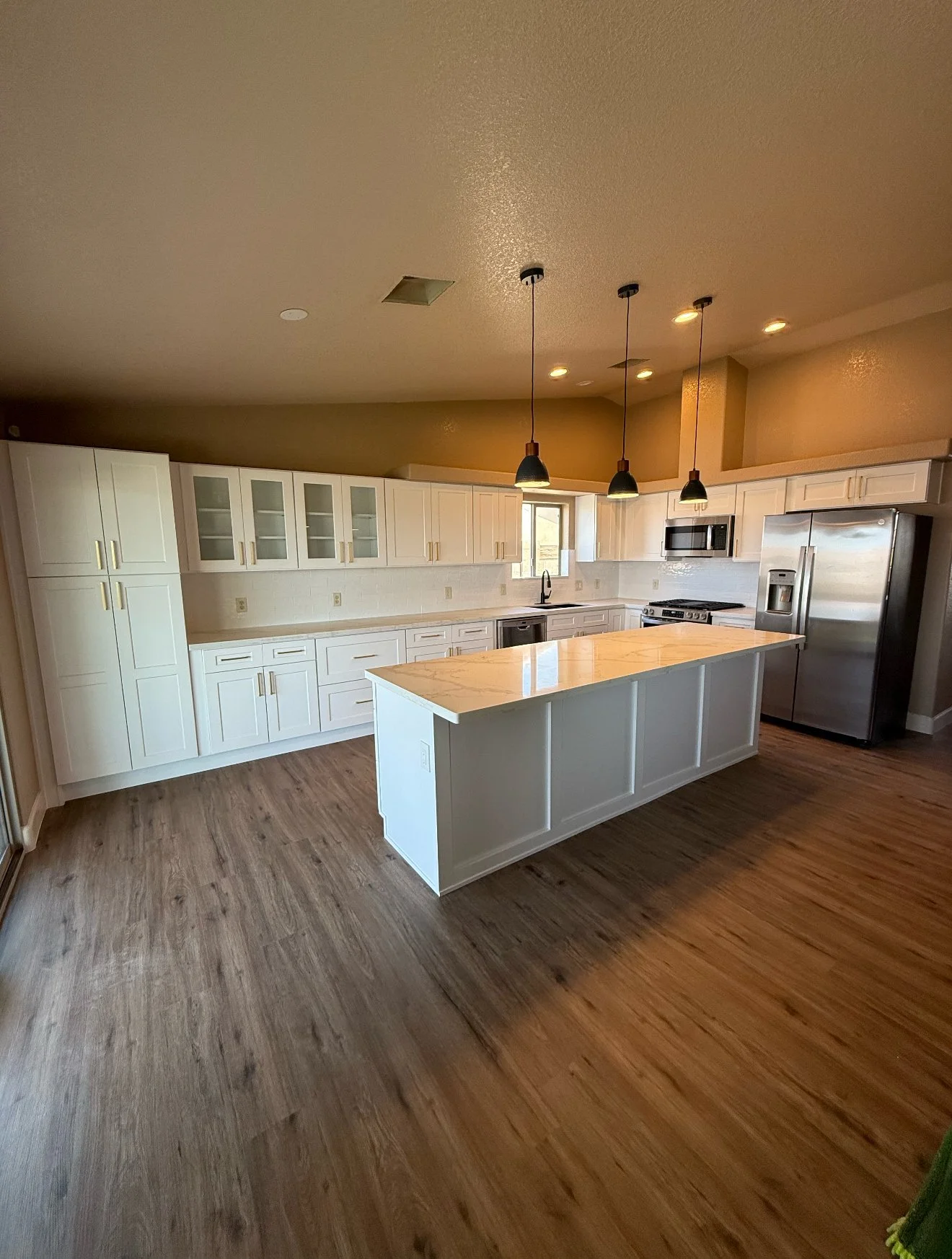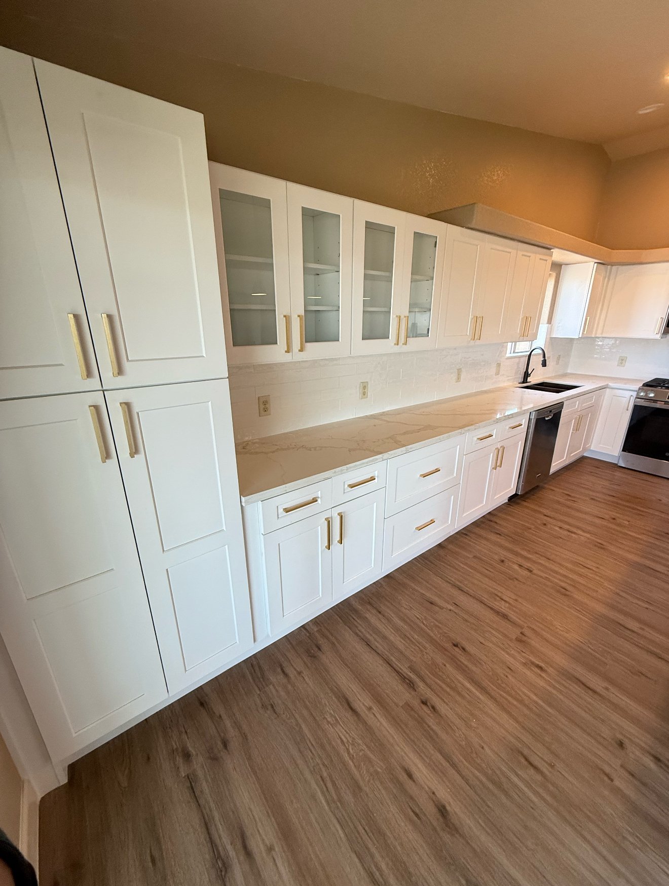 This full-home renovation features timeless white shaker cabinets, quartz countertops, and a clean tile backsplash, all brought to life with under-cabinet lighting. New flooring and baseboards were installed throughout the home, creating a cohesive and modern look that blends functionality with classic design.